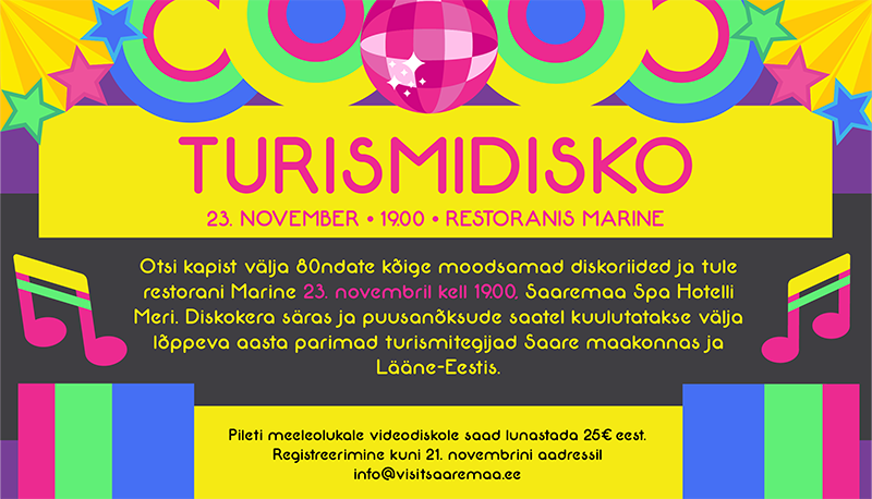 Auhindade üleandmine toimub ühisel turismirahva peol 23. novembril algusega kell 19.00 restoranis Marine, Saaremaa Spa Hotellis Meri. Kutse leiad SIIT!